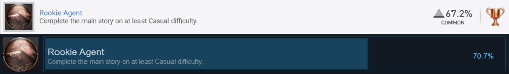 The achievement tied to completion, “Rookie Agent,” is unlocked by finishing the game on Casual difficulty or higher. This means players who complete the game on more challenging settings are also included in the same statistic.