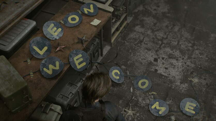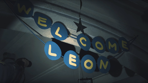 The famous welcome banner celebrating Leon’s arrival appears again inside the station. The extra letter L still exists nearby as a joke referencing the spelling mistake “Wellcome Leon” in the original Resident Evil 2.