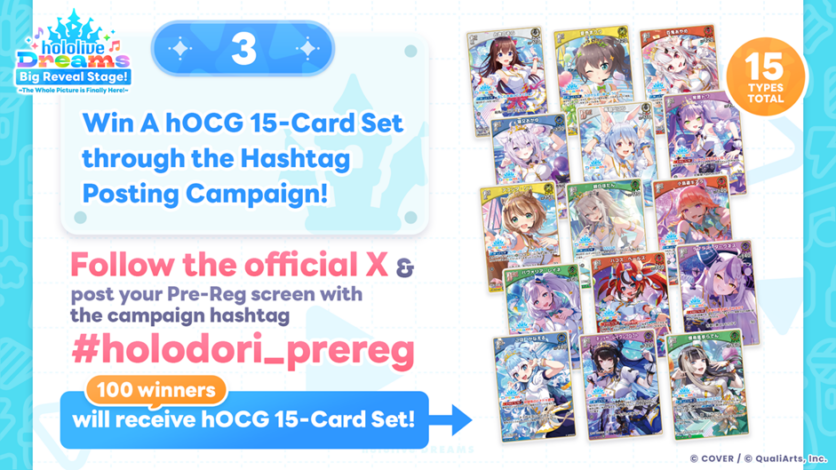 The third event encourages players to follow the game’s official X account and post using the hashtag #holodori_prereg. One hundred winners will receive a 15 card set from the hololive OFFICIAL CARD GAME (hOCG).