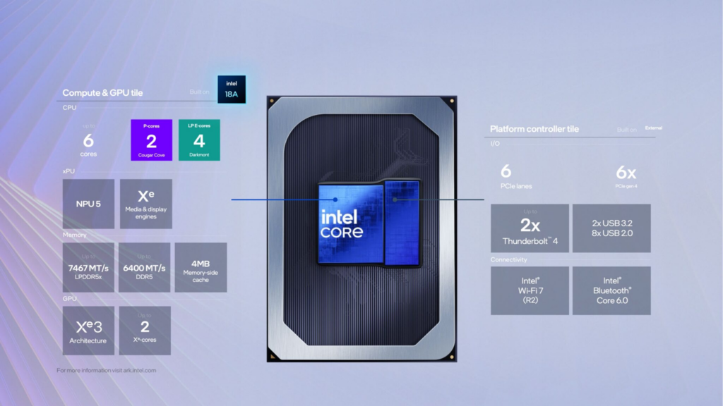 The chip configuration includes 2 Cougar Cove performance cores (P-cores) and 4 Darkmont efficiency cores (E-cores), paired with the latest Xe3 integrated graphics.