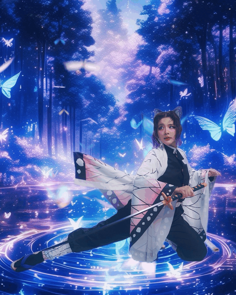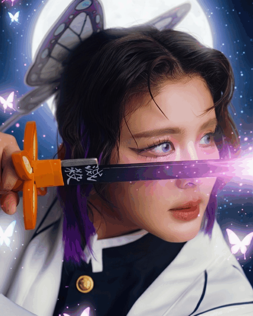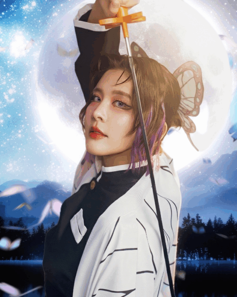 • The Look: Noona flawlessly captured Shinobu’s iconic look, complete with the butterfly-patterned haori, the intricate hair clip, and the distinct purple gradient of the character’s hairstyle.