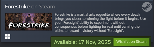 Forestrike is coming soon. The game launches November 17, 2025 on PC and Nintendo Switch. It mixes fast kung-fu combat with puzzle-like strategy.