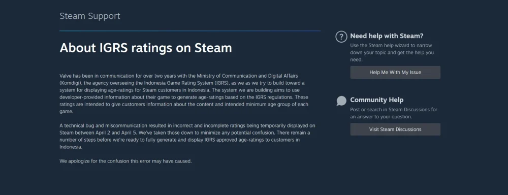 The company explained that it had been working for over two years with Indonesia’s Ministry of Communication and Digital (Komdigi) to properly integrate the IGRS rating system into Steam. This system relies on developer-submitted data to calculate appropriate age ratings based on local standards.
