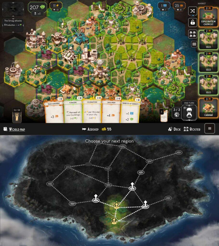 Dawnmaker blends strategic deck building with detailed city construction as players build a thriving settlement on a hex based map covered in poisonous fog. Only the player can ignite the ancient lighthouse that keeps the corruption at bay, and every structure placed contributes to reclaiming the land step by step. Players must construct buildings, collect new cards, gather valuable resources, and upgrade the lighthouse to unlock new construction zones while advancing deeper into the fog. The cycle of growth pushes the city forward and encourages players to think several turns ahead while strengthening their expanding settlement.