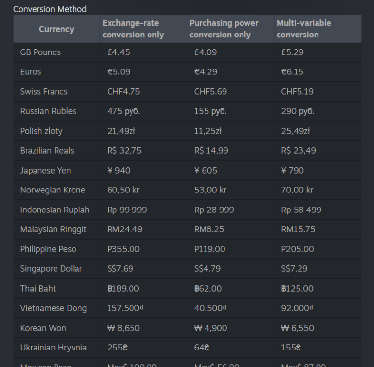 - Purchasing Power Conversion: This method focuses heavily on the average purchasing power of consumers within a specific country. It ensures the game remains affordable and accessible to local players, even if their local currency is currently weak against the global market.