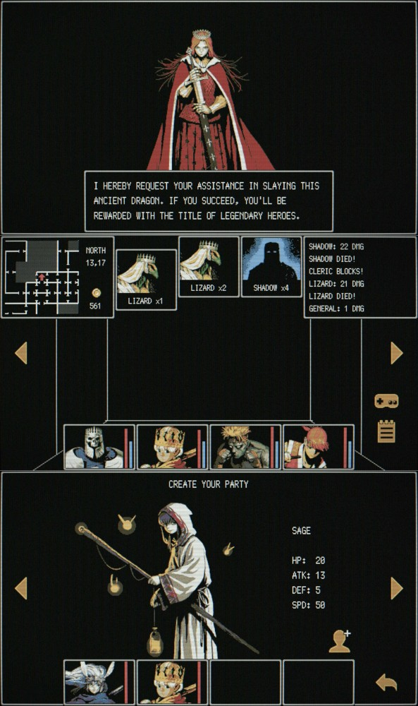 In Dragon Ruins, you play as the Commander, tasked with forming a 4-member party of heroes to explore dangerous dungeons and face off against ever-evolving monsters. The game offers 12 unique character classes, including knights and archers, allowing players to customize their party and strategy.