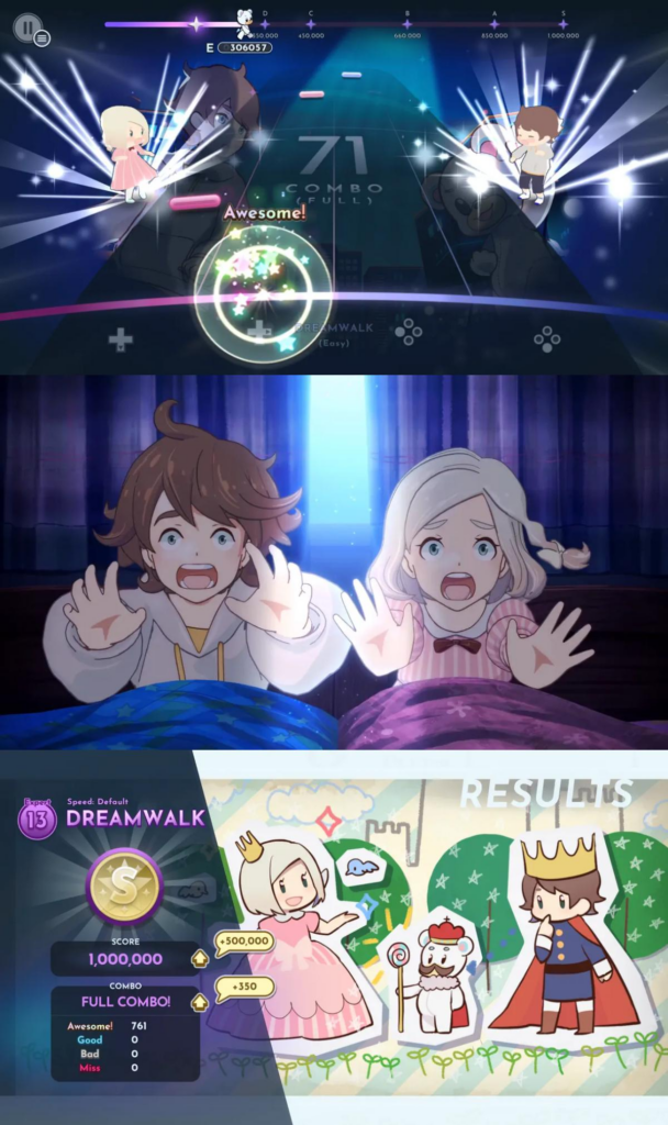 At its core, the game blends rhythm gameplay with narrative progression. Players follow the story of a pair of twins who embark on an adventure through a dreamlike fantasy world after their dreams transform into a surreal realm filled with music, emotion, and mystery. Story segments are delivered through animated cutscenes with full voice acting, adding depth beyond simple score chasing.