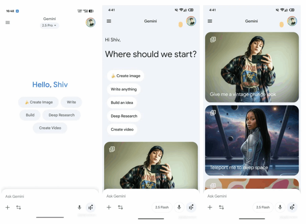 A highlight of this feed-based UI is its diversity of suggested prompts. For example, users might see options like “Teleport me to deep space” to generate cosmic visuals, “Give me a vintage grunge look” for creative image editing, or “Quiz me on basic biology” for quick knowledge checks. Gemini will also showcase examples of how it can be used for image generation, coding, or daily news summaries, all paired with visuals that make information easier to understand at a glance.