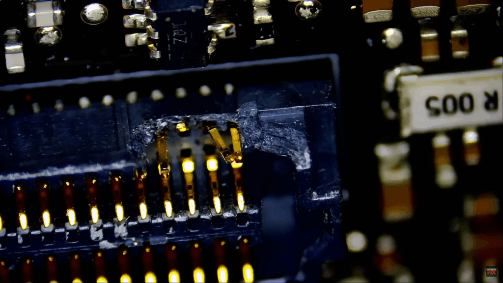 The specialist encountered a card that had stopped working. The owner had attempted to install a third party water cooling block. During this process, the user disconnected the PCIe interface to access the board. When they tried to connect it again, the damage occurred. A close examination under a microscope showed physical damage to the small internal connector. One pin was broken, and another was severely bent.