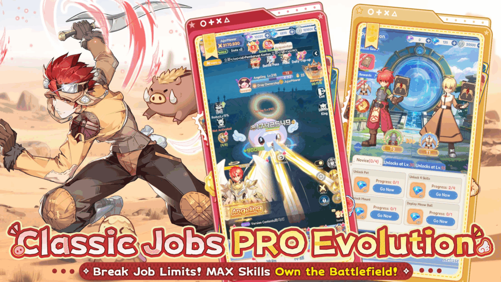 A major new feature is the Hero Transformation system. This allows players to evolve MVP monsters into playable Heroes. Players can transform into legendary bosses like Baphomet. The transformed Heroes gain incredible combat power. They can unleash devastating Calamity Skills to dominate the server. Furthermore, the game faithfully retains classic Ragnarok elements. This includes the nostalgic BGM, the adorable Poring and Lunatic pets, and the full job-transfer path. Players start as a Novice. They then progress to second-tier jobs like Swordsman, Acolyte, Mage, Thief, and Archer.