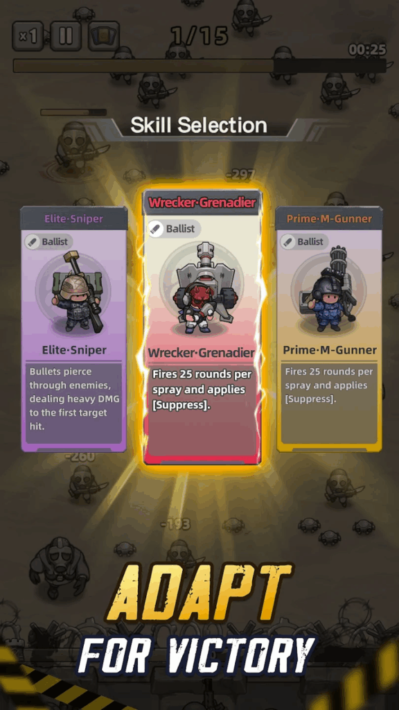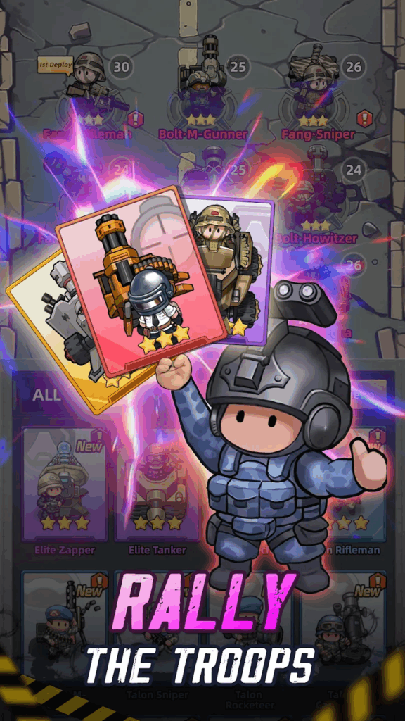 - Assemble Your Squad: Players can draft a diverse team. This squad includes snipers, gunners, tanks, and powerful Mechas. The goal is to tear through massive enemy waves.