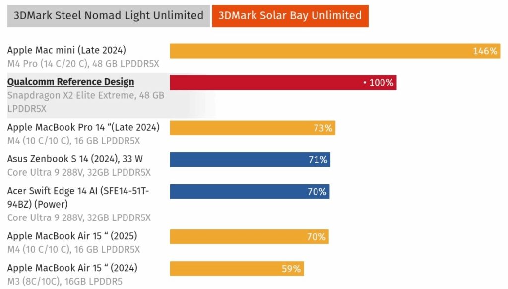 However, the GPU performance tells a different story. The Adreno X2-90 still lags behind the M4 Pro, scoring 5,687 in 3DMark Steel Nomad Light Unlimited — 37-46% lower — and 22,946 in Solar Bay Unlimited. While it outperforms the M4 10-Core by 37-40%, it cannot yet challenge Apple’s Pro-level GPU. Qualcomm is instead emphasizing performance per watt, noting that non-native Windows apps on Arm via Prism currently limit GPU-heavy tasks like gaming and rendering.