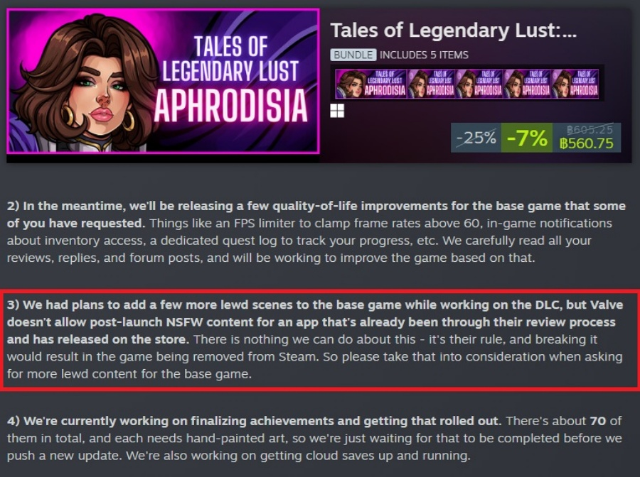Crimson Delight revealed that while they had planned to add adult scenes to Tales of Legendary Lust through future DLC development, Steam rejected the request. The reasoning given was that Valve does not allow the addition of NSFW content after a game has already passed review and launched. Violating this rule could result in a game being removed from Steam entirely.
