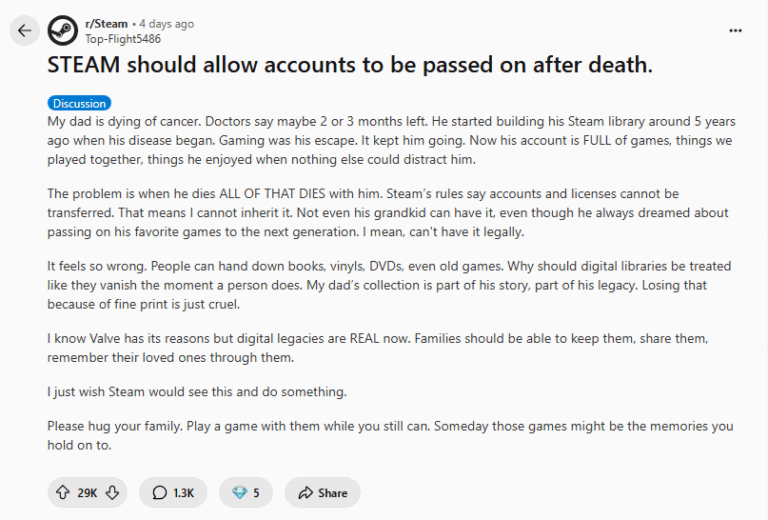 While acknowledging that Valve may have legal reasons for prohibiting account transfers, Top-Flight5486 appealed for the company to reconsider and allow exceptions in situations like his. He argued that digital games represent more than entertainment they are part of a person’s legacy. “Games have helped heal my father’s spirit during his treatment,” he shared. “It would be heartbreaking if everything he’s built simply disappeared with him.”