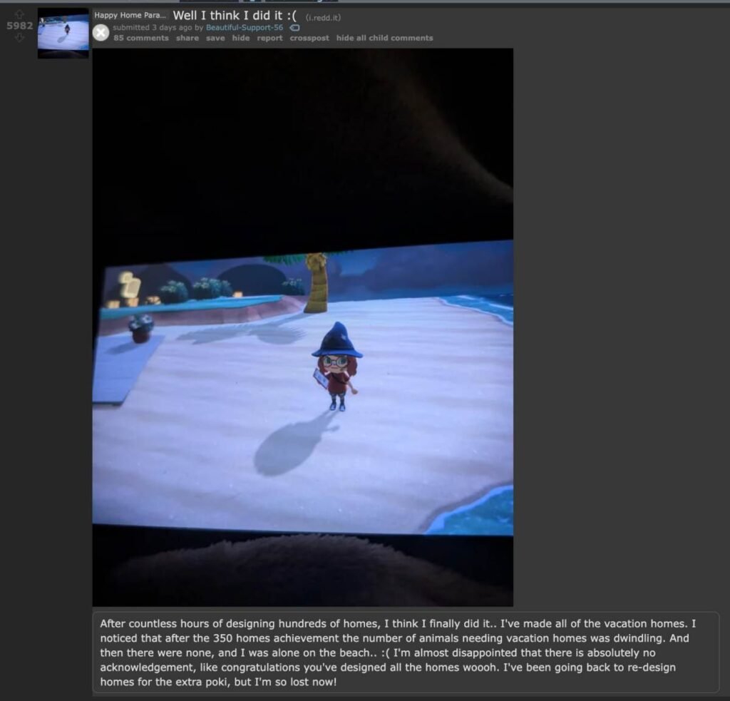 Upon completing the design requests for all available villagers—which eventually totaled over 400 houses—the player shared their experience on Reddit, noting the anticlimactic results.