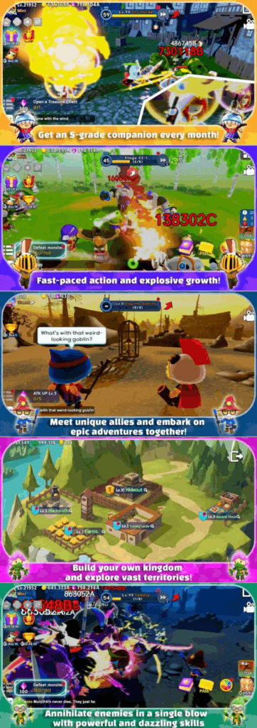 Master of Munchkin is built around the concept of “Munchkin Power”, an over-the-top, godlike strength! The game mixes easy auto-battle mechanics with spectacular “one-shot” skills that instantly wipe out enemies, delivering a satisfying hack-and-slash experience and rapid character growth.