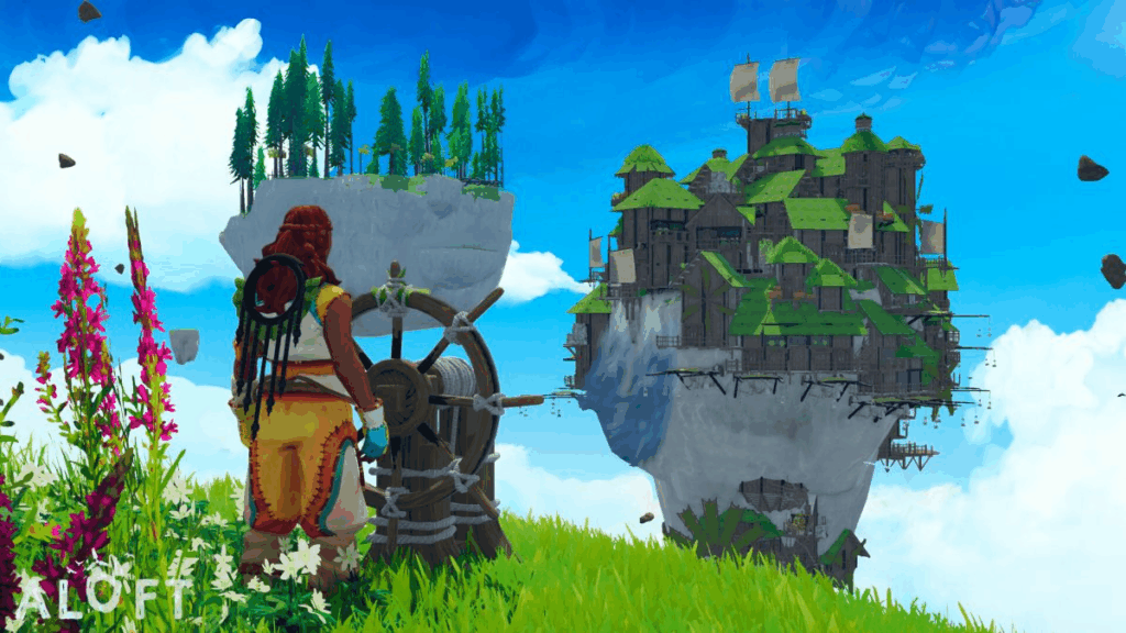 An action-adventure in a kingdom of clouds where players craft airships, build homes, raise animals, and battle mushroom demons, supporting up to 8-player online co-op.