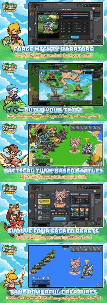 - Taming and Evolving: Players will focus on taming, leveling up, and evolving their dinosaurs. Each creature possesses unique skills that help the tribe thrive in the harsh environment of the stone age.
