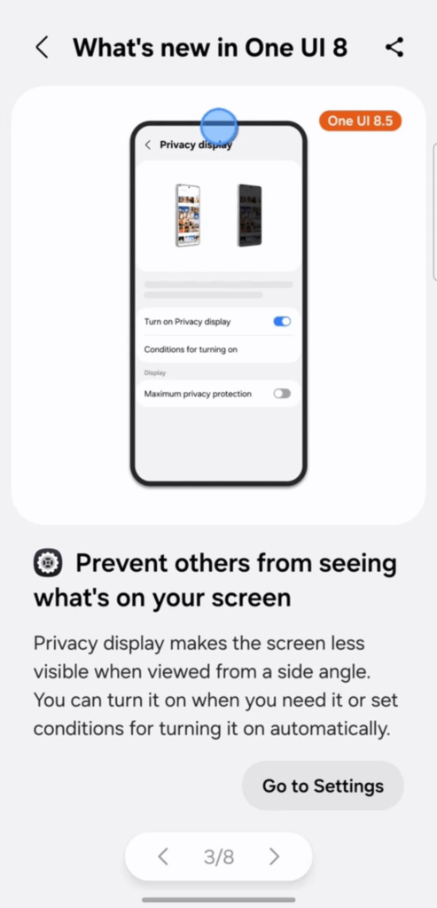 The feature is officially called Privacy Display, with detailed explanations found inside the Tips application in One UI 8.5. Its core function is to narrow the screen’s viewing angle when seen from the sides. When enabled, people nearby will only see a darkened or blurred display, making on-screen content difficult or impossible to read. Meanwhile, the user viewing the screen directly will continue to enjoy sharp visuals and vibrant colors consistent with Samsung’s display standards.